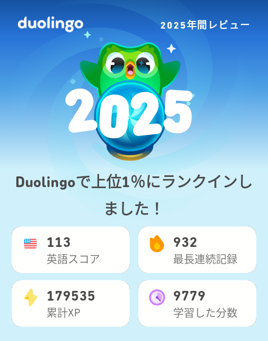 2025年の振り返りデータを見ると、学習時間は年間で9,779分。 1日平均に直すと、約26分。3年間で積み上げた時間は、計算上約433時間にのぼります。